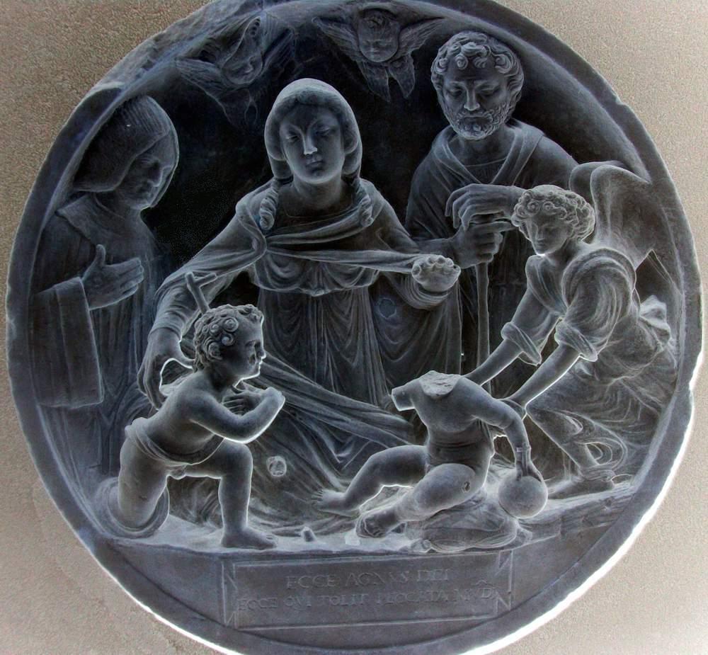 .......quanto al medaglione , benché in assenza d'ogni data non riesca possibile lo stabilire la provenienza sua anche approssimativamente e solo leggasi al basso in una cartella ad orecchiette nello stile del rinascimento la scritta: Ecce Agnus Dei, ecce qui tollit peccata mundi, lo stile del Busti riesce oltremodo pespicuo nella grazia della Vergine dinanzi di cui piedi stanno sollazzandosi il bambino Gesù e San Giovanni. Nello sfondo angeli oranti e testine alate di divini messaggeri e sul lato destro la figura barbuta di San Giuseppe : più importante sul lato sinistro una persona con larga giubba e dalla copioso zazzera sforzesca in cui direbbesi effigiato lo stesso Duca Lodovico il Moro. (1) |